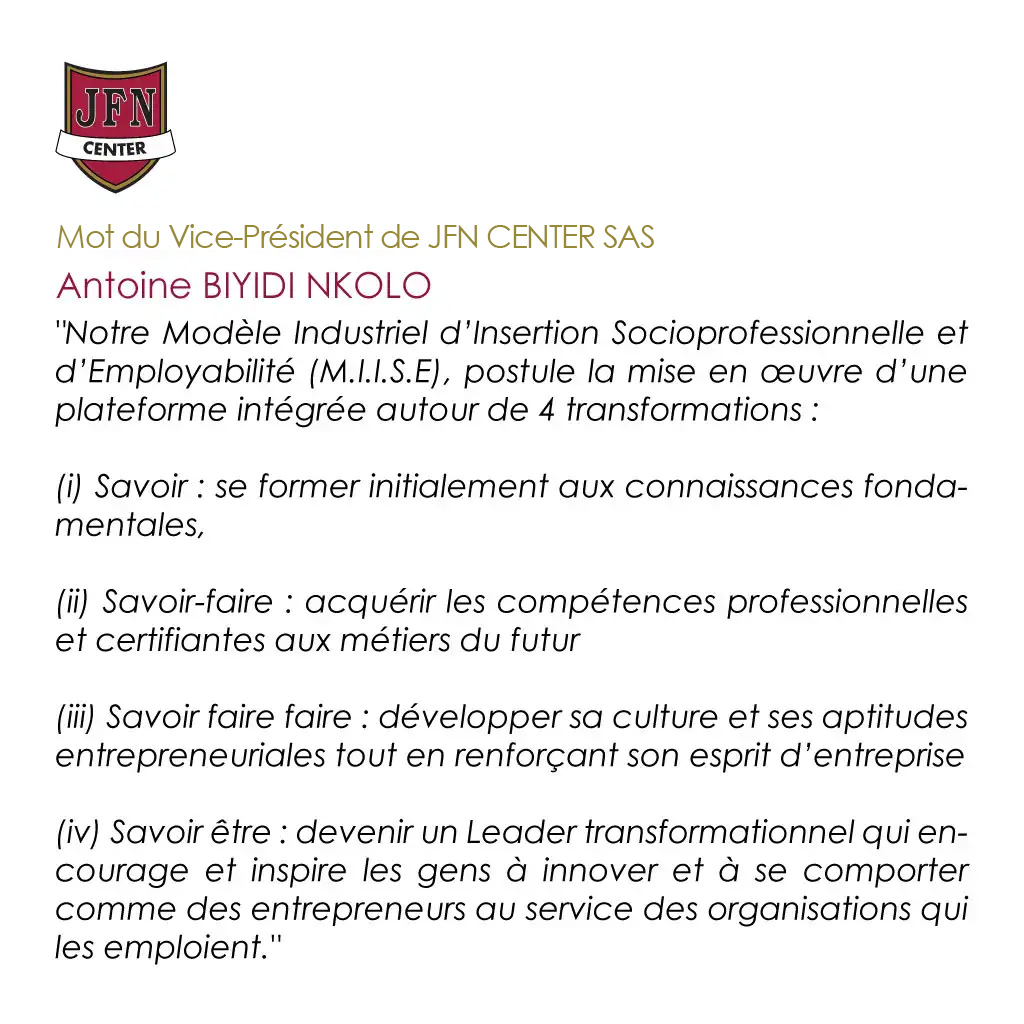 JFN CENTER est une entreprise qui développe ses activités dans les domaines de l’Entrepreneuriat, de l’Innovation appliquée, de la Transformation digitale des organisations, de l’Industrie 4.0, de la Formation Professionnelle et Continue, du Conseil et Recherche de financements.